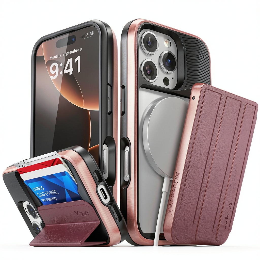 The Vena vCommuteX is a premium wallet case designed specifically for the Apple iPhone 16 Pro, featuring a 6.3-inch display. Crafted from high-quality polycarbonate (PC) and shock-absorbing thermoplastic polyurethane (TPU), this case integrates a patented removable MagSafe-compatible wallet that securely holds up to three cards, such as IDs or credit/debit cards. It exceeds MIL-STD 810G-516.6 drop-test standards, surviving 26 drops from 8 feet high with CornerGuard technology that disperses impact forces. The case includes precise cut-outs for easy access to all ports and buttons, maintaining the phone’s tactile feedback, and supports MagSafe wireless charging when the wallet is detached. Available in models like Space Gray/Black (VN2333VP) and Red/Rose Gold/Black (VN2334VQ), it is designed in Minnesota to blend innovation with everyday utility.